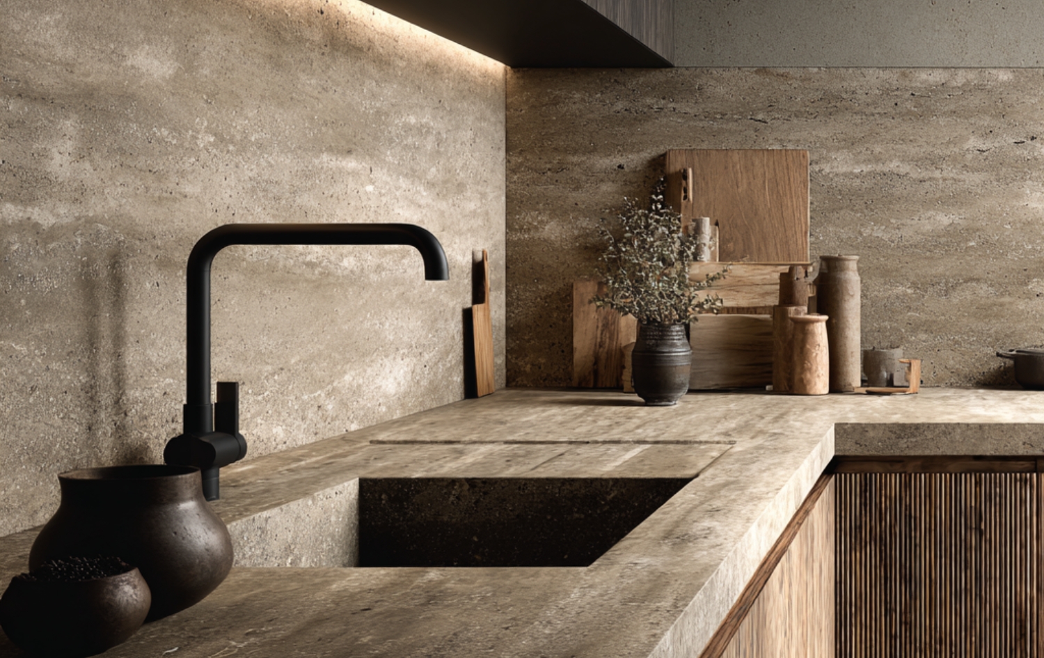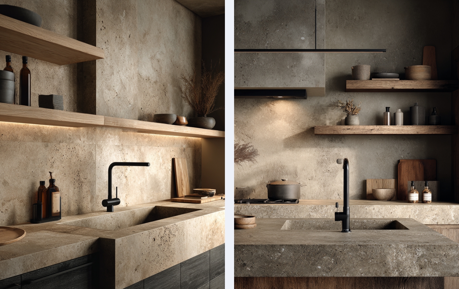Wyobraź sobie blat kuchenny, który płynnie przechodzi w zintegrowany zlew z ciemnego trawertynu – bez połysku, za to z charakterem. Albo stół jadalniany z ciężką, kamienną płytą, która wygląda jak wyrwana prosto z ziemi. Do tego subtelne oświetlenie i naturalne drewno – i masz przestrzeń, która zamiast krzyczeć „błysk”, mówi: „prawda”.