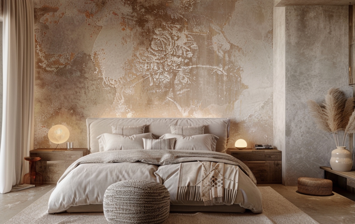 Wyobraź sobie sypialnię, w której ściana za łóżkiem nie jest gładka jak tafla, ale przypomina płótno – z subtelnym wzorem, jakby ktoś namalował go intuicyjnie, z pamięci. Albo salon, w którym pojawia się ogromny mural inspirowany haftem – geometryczne lub florystyczne wzory przeniesione z tkaniny na tynk, delikatnie wypukłe, wyczuwalne pod palcami.