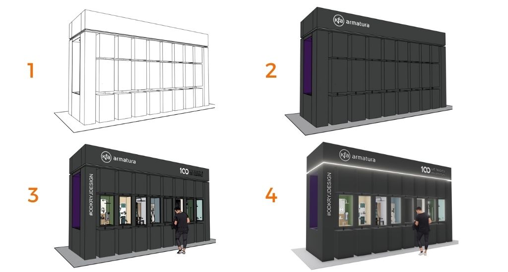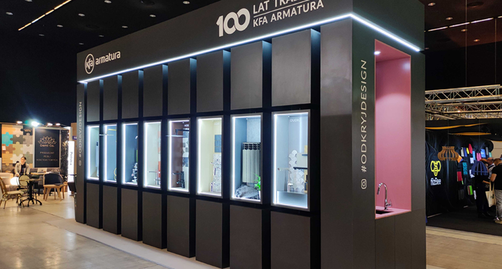 Ostatecznie zrealizowana koncepcja ekspozycji KFA Armatura na 4 Design Days w Katowicach stanowiła ciemną, monolityczną bryłę, o niebanalnej zawartości. Stoisko zostało podzielone na dziesięć mniejszych elementów, których wnętrze zostało ukryte. Osiem z wyznaczonych modułów stanowiło podświetlone boksy w kształcie prostopadłościanów zachęcających osoby zwiedzające do zatrzymania się przy stoisku i wejścia z nim w interakcję. Krótkie hasła i oznaczenia prowokują do odwrócenia każdego boksu o 180° – „Sprawdź co kryje się w środku”, „Poznaj ciekawe historie”, „Szukaj”, „Znajdź inspiracje”. Po ich drugiej stronie ukryte zostały produkty KFA (baterie, deszczownice, grzejniki) zestawione z unikalnymi propozycjami aranżacji. W taki sposób powstało szesnaście charakterystycznych „moodboardów”, po osiem z każdej strony prostopadłościanu. Na jego krótszych bokach znalazły się również dwie wnęki poświęcone nowoczesnym bateriom kuchennym. Ekspozycja zaprojektowana w taki sposób zaskakiwała na tle innych, standardowych stoisk targowych oraz zachęcała do zabawy designem, poprzez odkrywanie i inspirowanie. Ponadto, projektując całość miałam na uwadze łatwość prezentacji stoiska w mediach społecznościowych. Każdy z boksów został oświetlony oraz skomponowany tak, aby atrakcyjnie prezentować się nie tylko „na żywo”, ale przede wszystkim na zdjęciach i nagraniach z targów.
